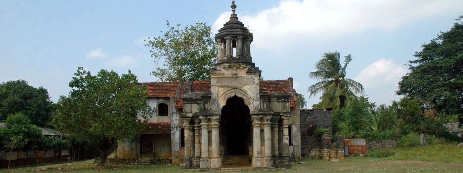 The structure is renowned for its Mayo stone construction, lime-plastered walls, and South Indian architectural influences, including circular columns visible at the main entrance and interior.