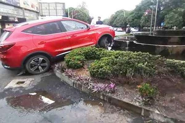 The luxury car ran over the police officer who was on traffic duty at the site and collided with the fountain in the middle of the roundabout.